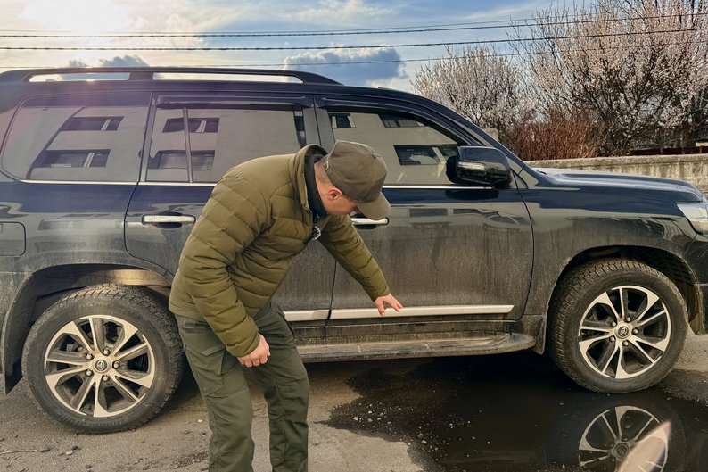 Вячеслав Задоренко показує, куди до його авто прикріпили вибухівку. Суспільне ХарківНахилившись під машину, я побачив пристрій, схожий на вибухівку, після чого я одразу набрав службу ДСНС, повідомив поліцію. Мені казали, щоб машину в ніякому разі я не заводив, не запускав двигун.