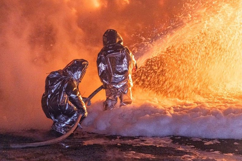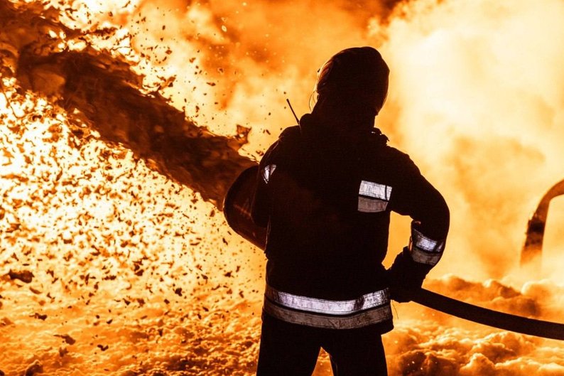 Рятувальник гасить пожежу в Чугуєві, яка виникла внаслідок атаки безпілотників, 5 липня 2025 року. ДСНС Харківщини/Facebook