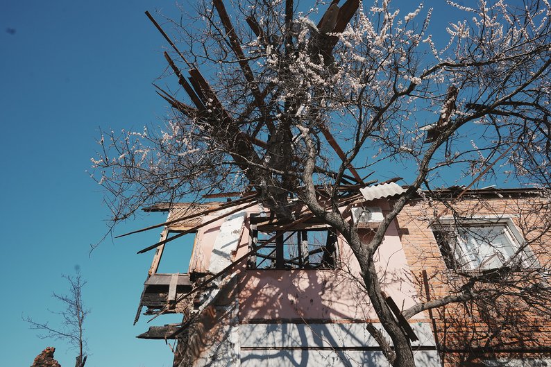 Абрикос зацвів біля залишку стіни двоповерхового житлового будинку у Харкові, 4 квітня 2025 року. У цьому домі у Новобаварському районі у ніч на 4 квітня загинули п’ятеро людей. По ньому, як і по сусідній багатоповерхівці, російські військові поцілили безпілотниками. Суспільне Харків/Вікторія Якименко
