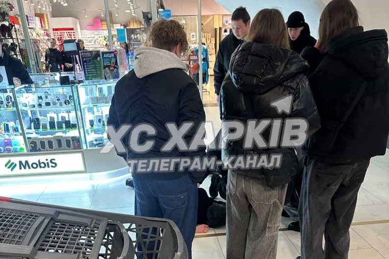 Молоді люди, які стоять біля 22-річного чоловіка, що впав з ескалатора у ТЦ “НІкольський”, 14 лютого 2026 року. Telegram-канал ХС Харків