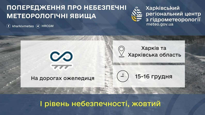 Попередження про ожеледицю на дорогах у Харкові та області 15-16 грудня. Харківський гідрометцентр