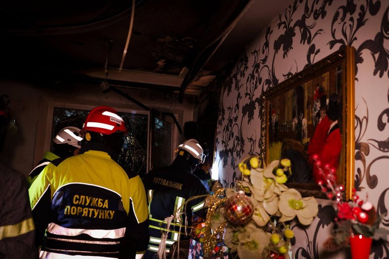 Пожежа в будинку, пошкодженому ударом російського “Шахеда” в Холодногірському районі Харкова, 18 січня 2026 року. ДСНС Харківщини