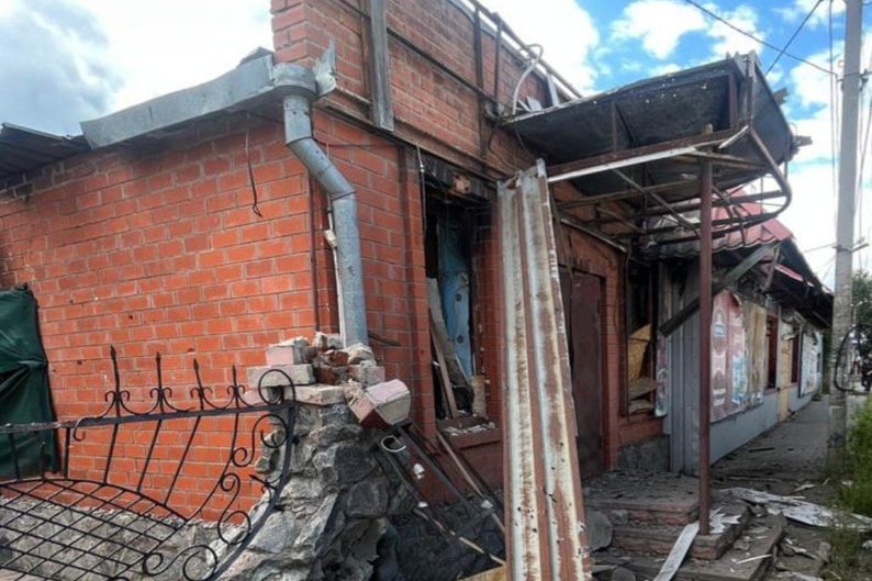 Пошкоджений внаслідок російського влучання фасад магазину в Старому Салтові, Харківська область, 24 серпня 2025 року. Поліція Харківщини