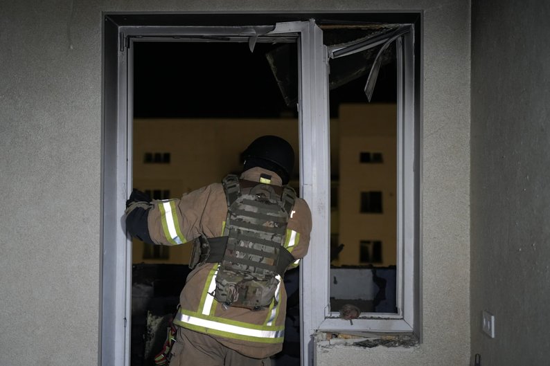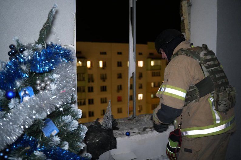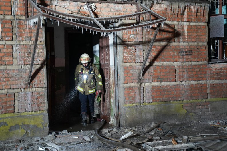 Рятувальник на місці влучання по горішньому поверху дев’ятиповерхівці в Індустріальному районі Харкова, 24 січня 2026 року. Суспільне Харків/В’ячеслав Мавричев