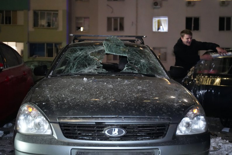 Потрощена автівка біля дев’ятиповерхівки, в яку влучив дрон в Індустріальному районі Харкова, 24 січня 2026 року. Суспільне Харків/В’ячеслав Мавричев