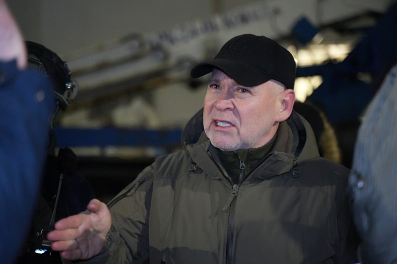 Міський голова Ігор Терехов на місці влучання по горішньому поверху дев’ятиповерхівці в Індустріальному районі Харкова, 24 січня 2026 року. Суспільне Харків/В’ячеслав Мавричев