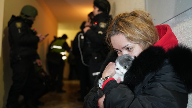 Жінка обіймає свою кішку в укритті під час російської атаки безпілотниками, Індустріальний район, Харків, 24 січня 2026 року. Суспільне Харків/В’ячеслав Мавричев