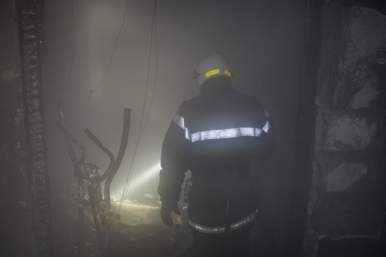 Рятувальник на місці влучання по горішньому поверху п’ятиповерхівці в Індустріальному районі Харкова, 24 січня 2026 року. Суспільне Харків/В’ячеслав Мавричев