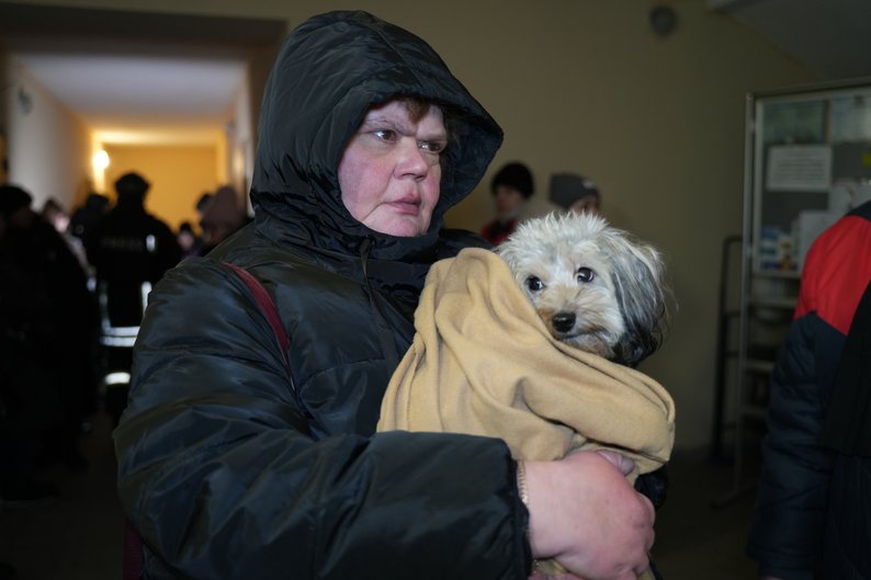 Жінка разом зі своїм собакою укритті під час російської атаки безпілотниками, Індустріальний район, Харків, 24 січня 2026 року. Суспільне Харків/В’ячеслав Мавричев