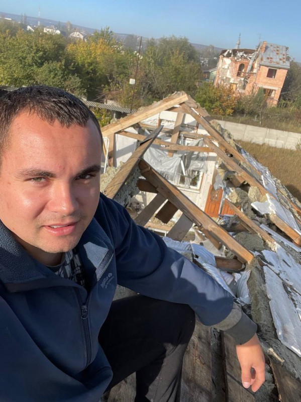 Руслан на даху зруйнованого через обстріли будинку. Фото надала дружина Ліна Пилипака