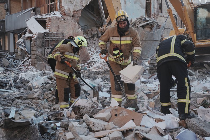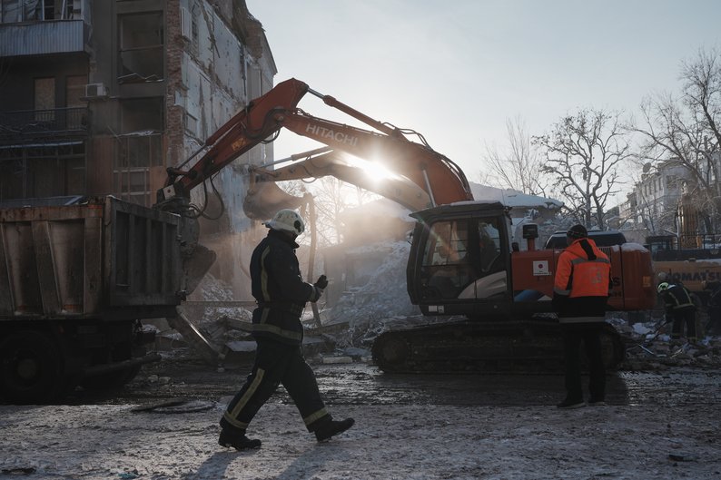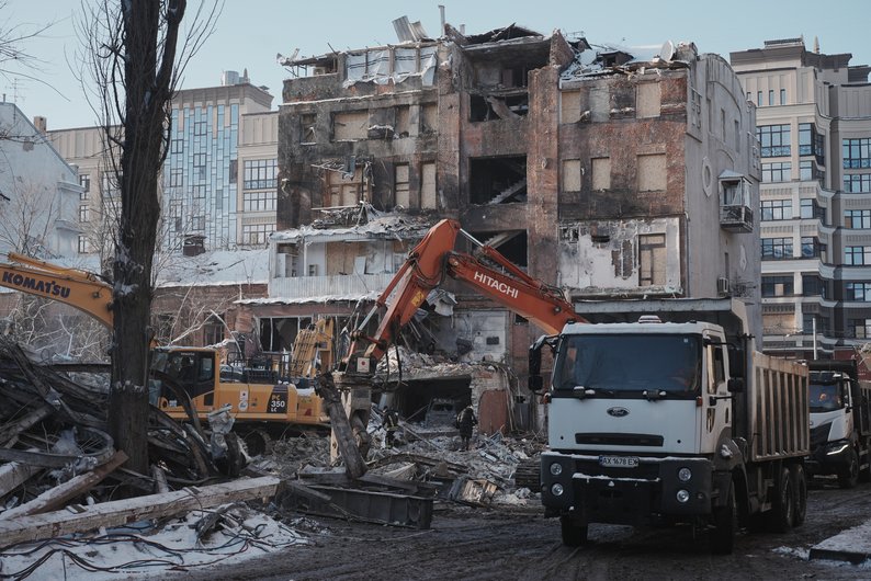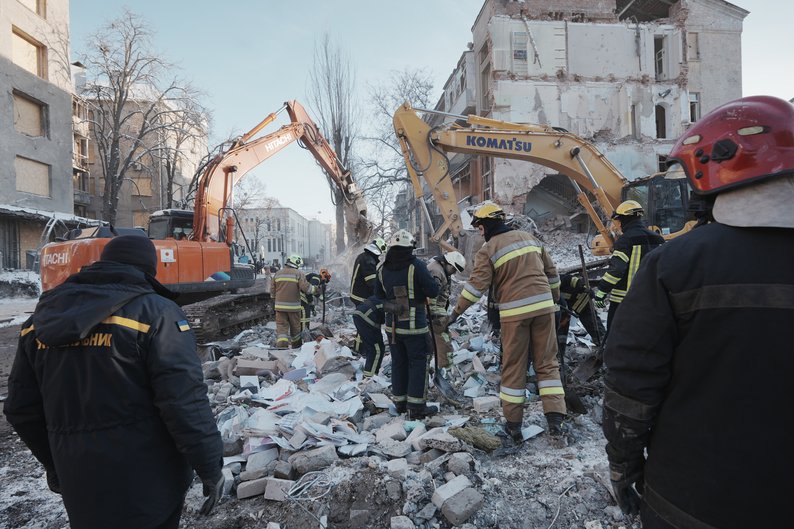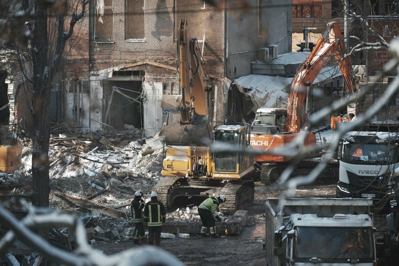 Розбір завалів на місці руйнування будівель у центрі Харкова внаслідок вибухів, 5 січня 2026 року. Суспільне Харків/Вікторія Якименко
