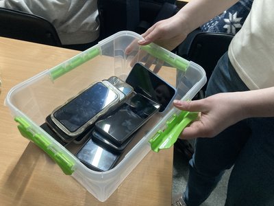 Контейнер для телефонів дітей, які навчаються в укритті економічного університету, Харків, квітень 2026 року. Суспільне Харків/Роман Кривко