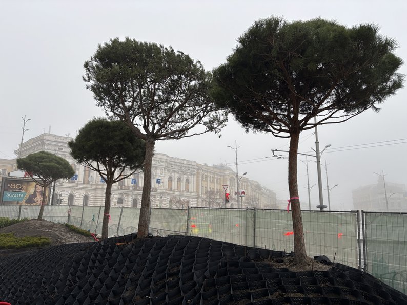Сосни, які висадили у зеленій зоні біля “Градусника” у Харкові, 27 листопада 2025 року. Суспільне Харків/Давид НадворнийМи знайшли переплати в декілька разів на ці дерева і, в принципі, цей острівець з благоустроєм та чотирма деревами обійшовся в понад п’ять мільйонів гривень з бюджету.