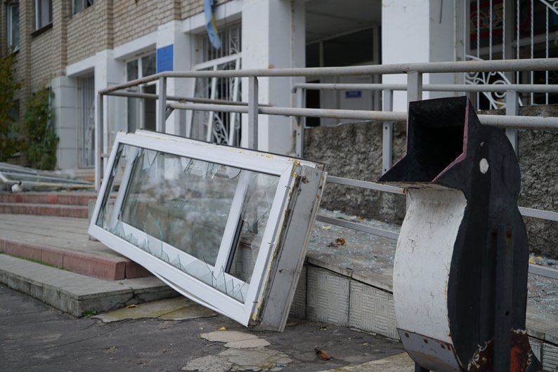 Вибите вікно біля входу в ліцей в Ізюмі. Суспільне Харків/Валерія Ємець
