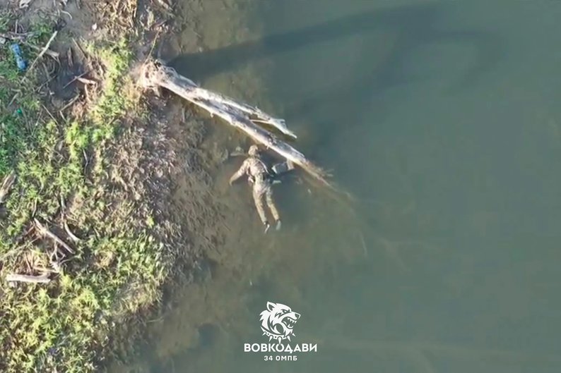 Тіло російського окупанта у річці, Вовчанськ, Харківська область, квітень 2025 року. 34 окремий мотопіхотний батальйон “Вовкодави”