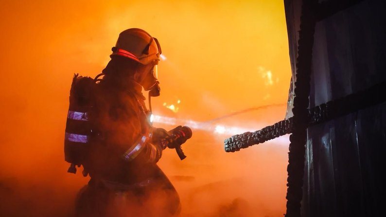 Рятувальник гасить пожежу, яка зайнялася на території приватного підприємства у Новобаварському районі Харкова, 8 грудня 2025 року. ДСНС Харківщини