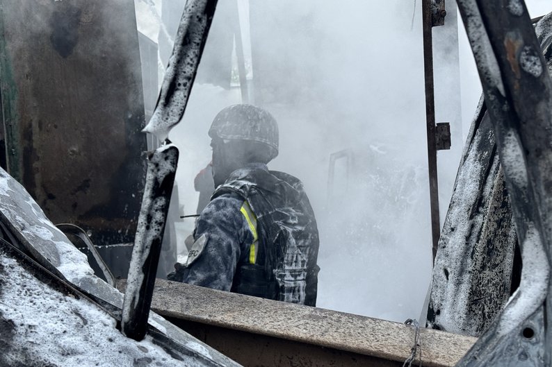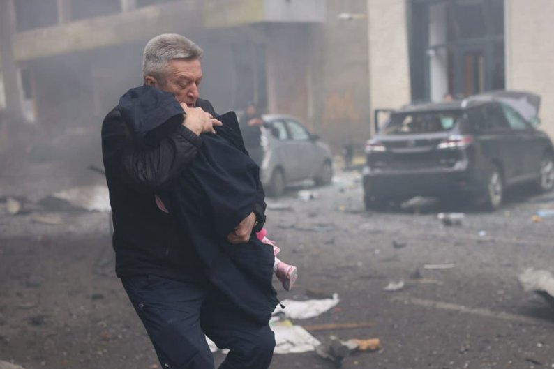 Генерал-майор цивільного захисту Олександр Волобуєв несе на руках дівчинку після влучання російського безпілотника в дитячий садок, Харків, 22 жовтня 2025 року. ДСНС Харківщини