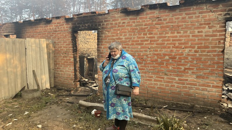 Жінка, яка втратила житло внаслідок лісової пожежі, яка перекинулась на місто, Ізюм 2025 рік. Суспільне Харків/Дмитро Гребінник