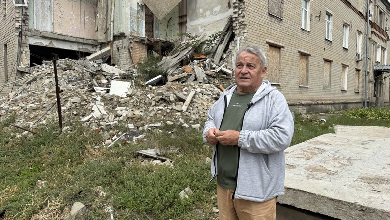 Олександр Гряник біля пошкодженого через російські обстріли корпусу школи. Суспільне Харків/Лариса Говина