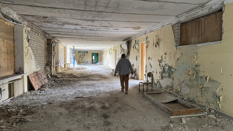"Ми перебуваємо з вами у 21-му кабінеті, який був кабінетом російської мови та літератури. І саме сюди було влучання. Я згадую, як тут йшли танки. Вони ж до стовпів доходили", — розповів керівник навчального закладу.