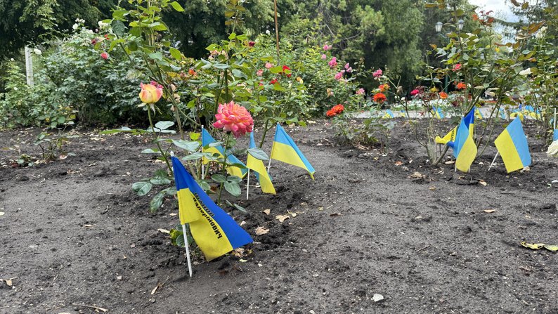 Серед колишніх випускників Олександра Гряника — волонтери та захисники, які нині боронять Україну. Є й такі, хто загинув під час війни. Тому працівники школи та колишні учні висадили троянди на їхню честь, каже директор ліцею. Біля них — 32 іменні прапорці.