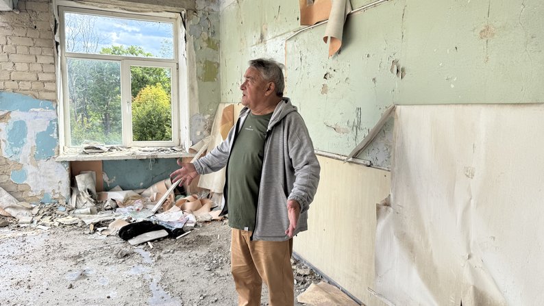 Олександр Гряник в кабінеті російської мови та літератури ліцею №62, який був зруйнований через російський обстріл. Суспільне Харків/Лариса Говина