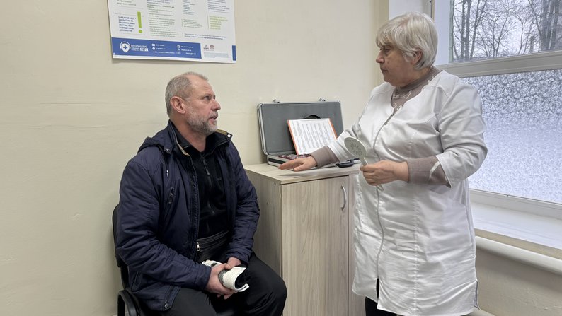 Переселенець Ігор Гончаров на прийомі у лікаря у Куп’янському медцентрі, січень 2026 року. Суспільне Харків/Лариса Говина