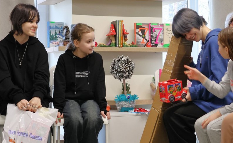 Свято для дітей із Вовчанська в Харкові, січень 2025. Олені Святого Миколая/Facebook/So VaЦе деокуповані території, вони близько до зони бойових дій. В Ізюмі зараз взагалі сконцентровані евакуйовані з Борівської громади діти. Це діти, до яких ми ще в Борову, в Піски-Радьківські їздили в минулі роки. Зараз вони евакуйовані, знаходяться в Ізюмі — там є центр, доволі безпечний простір. Ми зараз дуже намагаємося, щоб там, де ми збираємо дітей, був безпечний простір.