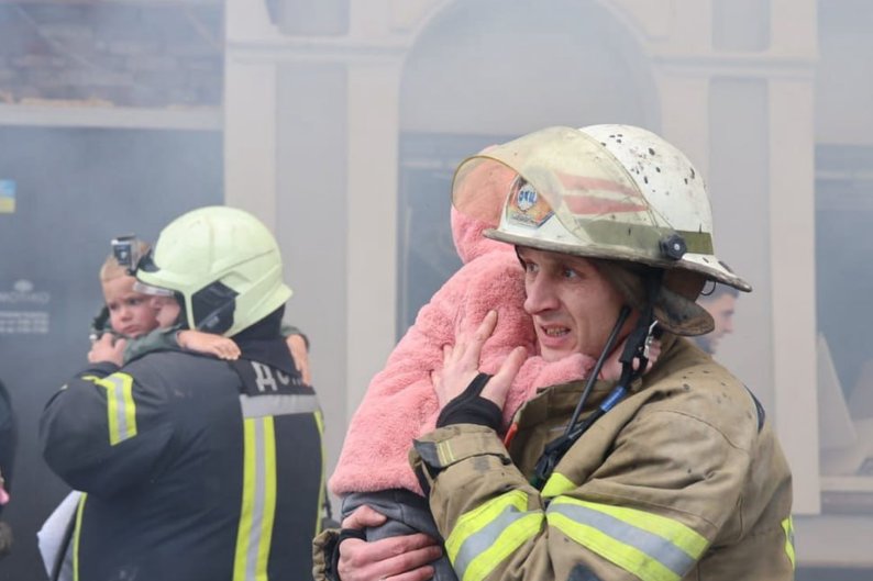 Рятувальники несуть дітей після удару по дитячому садочку в Харкові, 22 жовтня 2025 року. ДСНС Харківщини