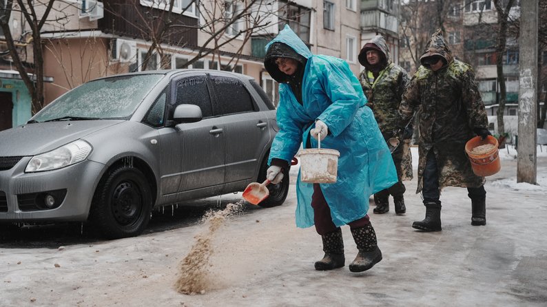 Двірничка посипає дорогу піском у Харкові, 30 січня 2026 року. Суспільне Харків/Вікторія Якименко