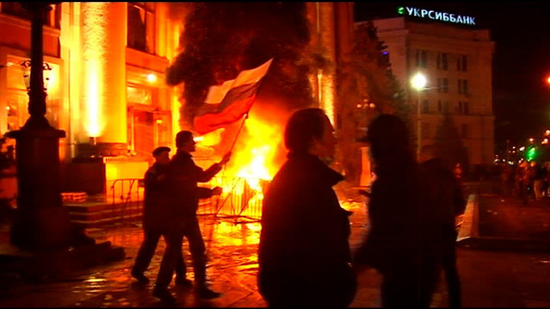 Пожежа напередодні звільнення Харківської ОДА. Сепаратист розмахує прапором Росії. Архів