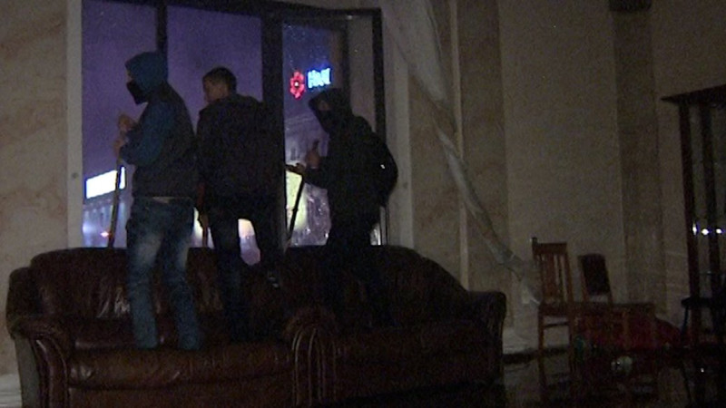 "Почалася боротьба: одні намагалися відкрити двері, вона була закрита дерев'яною палкою, а інші казали, беріть його у заручники, ми його винесемо на площу, так буде з кожним", — розповів Чернов, якому допомогли вийти з будівлі.