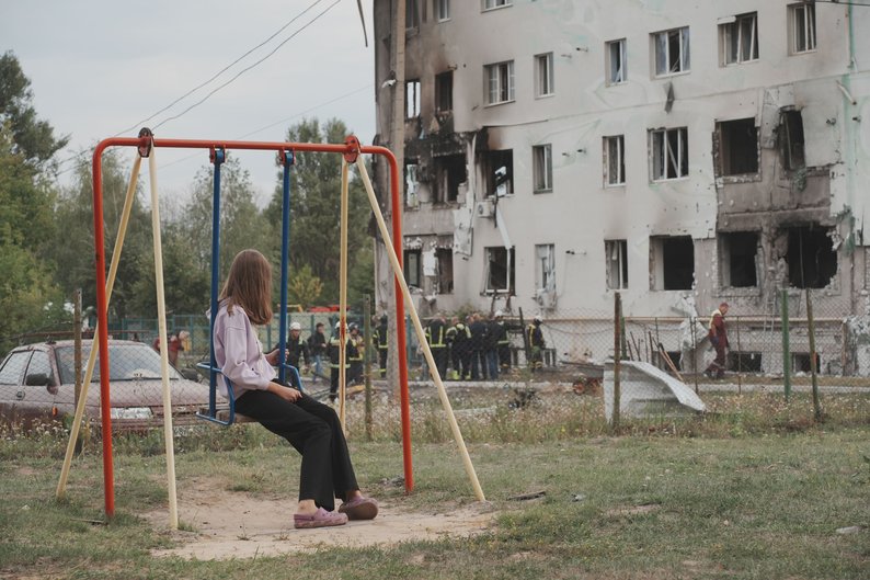 Дівчинка на гойдалці поруч з місцем удару “Шахедів” на Індустріальний район Харкова, 18 серпня 2025 року. Суспільне Харків/Вікторія Якименко