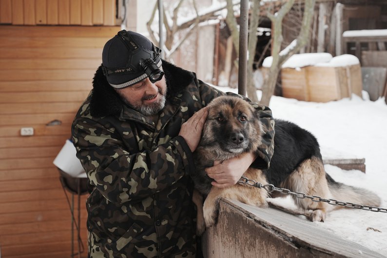 Олег Маханьов з собакою Джесєю, яку родина вивезла з Куп’янська. Суспільне Харків/Вікторія Якименко