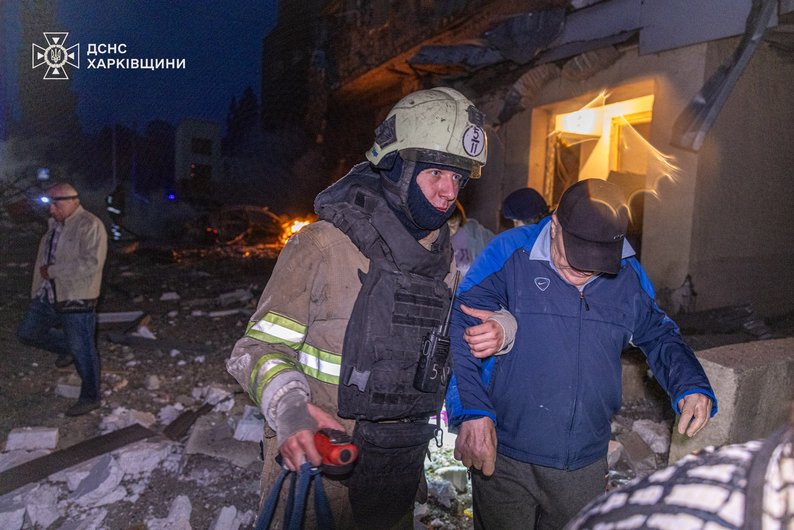 Працівник ДСНС допомагає евакуювати людей з пошкодженого будинку на Салтівці у Харкові після атаки дронів, 12 червня 2025 року. ДСНС Харківщини
