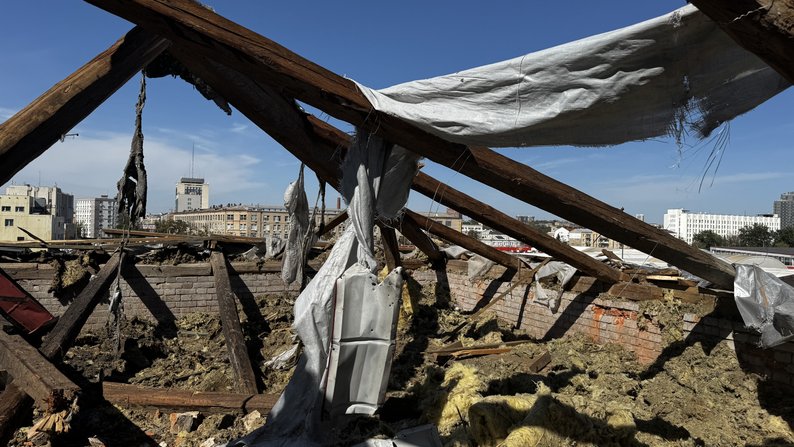 Наслідки влучання російського дрона по навчальному закладу в Слобідському районі Харкова, 16 вересня 2025 року. Суспільне Харків/Олександра Новосел Логіки шукати від обстрілів немає сенсу жодного, як будь-який цивільний обʼєкт, який страждає від обстрілів в Україні, так само і наш корпус постраждав.