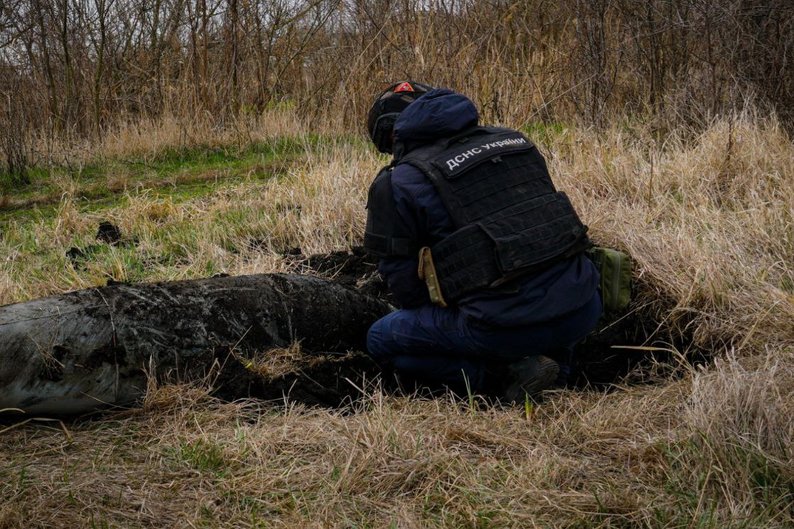 Працівник ДСНС вилучає нерозірвану ФАБ-500, яку знайшли в Слатиному Харківської області. ДСНС Харківщини