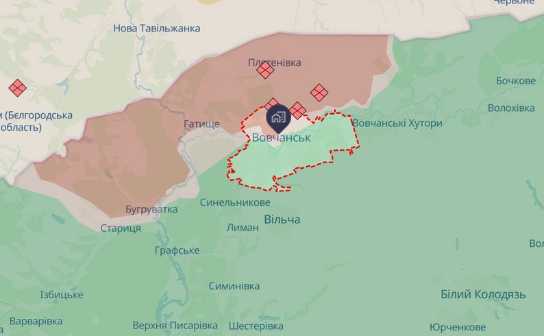 Вовчанськ на мапі Deep State за 13 липня 2025 року. DeepStateMAP