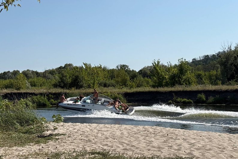 Катер їде повз пляж на річці в Харківській області, літо 2025 року. Ангеліна Климова