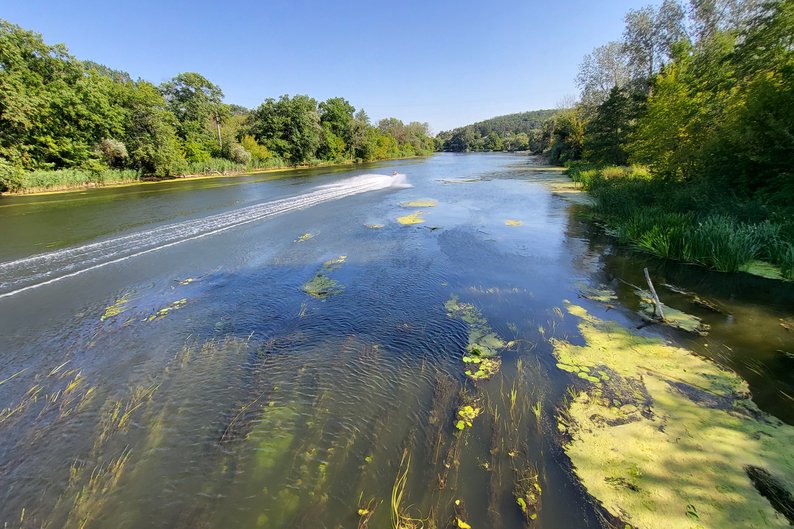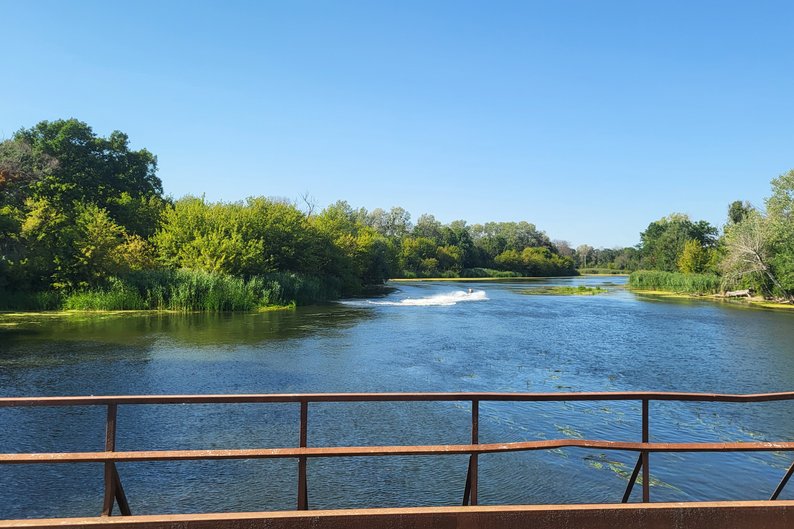 Гідроцикл їде річкою в Харківській області, серпень 2025 року. Суспільне Харків/Марія Солодовнік