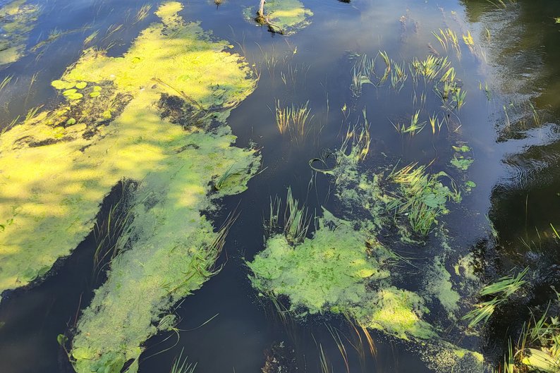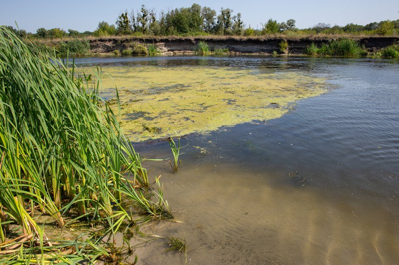Ряска на поверхні ріки, Харківська область, серпень 2025 року. Суспільне Харків/Марія Солодовнік