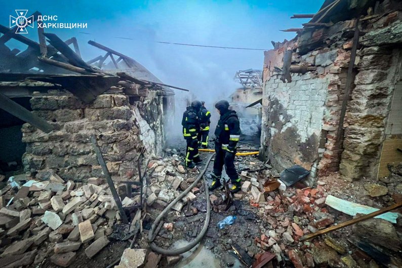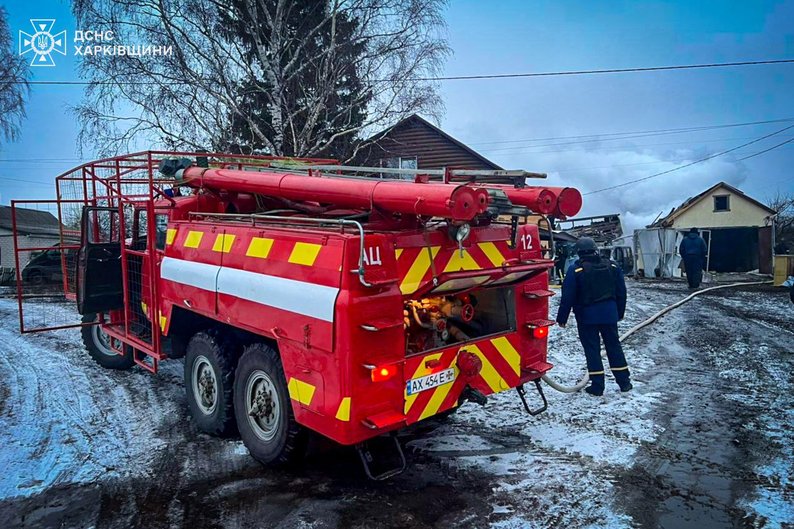 Рятувальники гасять пожежу у селі Заміст на Харківщині після атаки російського БпЛА, 17 грудня 2025 року. ДСНС Харківщини