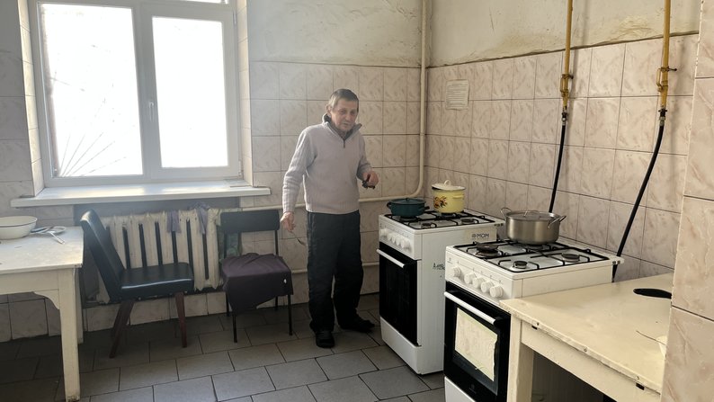 "Я тільки з кухні прийшов, там у мене каша вариться. Зараз піду туди, з місця на місце, чайник приніс — будемо грітися", — говорить чоловік.