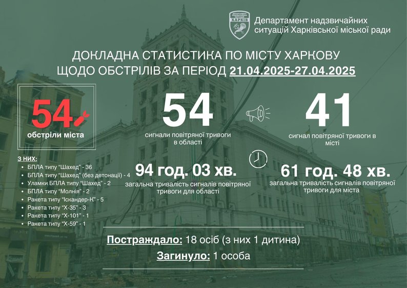 Обстріли Харкова 21-27 квітня 2025 року: інфографіка. Ігор ТереховЗа останній тиждень тривалість повітряних тривог у Харкові скоротилася на 32 години — це на 34% менше, ніж середня тривалість тривог по області. І загалом за два місяці повітряні тривоги в місті тривали на 230 годин менше.