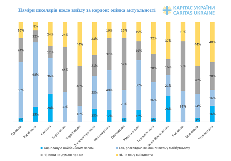 Найбільше тих, хто хоче виїхати найближчим часом, проживає у Сумській (28%), Івано-Франківській (26%), Чернівецькій (16%) та Харківській (15%) областях. Підлітки з Харківської області лідирують у групі, що збирається в еміграцію у віддаленій перспективі. Таких серед опитаних виявилося аж 65%.