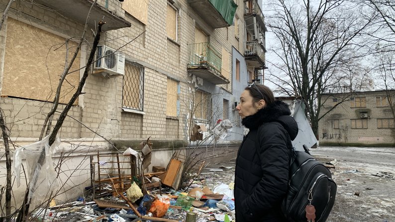 Юлія Шарпар, мати Дмитра, поруч зі своїм будинком, який пошкодив російський обстріл, 2023 рік. Фото: Валерія Ємець/Суспільне Харків