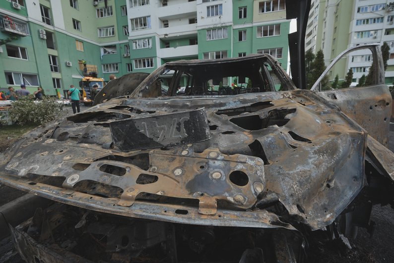 Житель Харкова Максим Новак перебував у своїй квартирі, коли росіяни вдарили КАБами по Шевченківському району міста вдень 24 липня. Чоловік з балкона побачив, що від удару горить його припаркована біля будинку автівка.