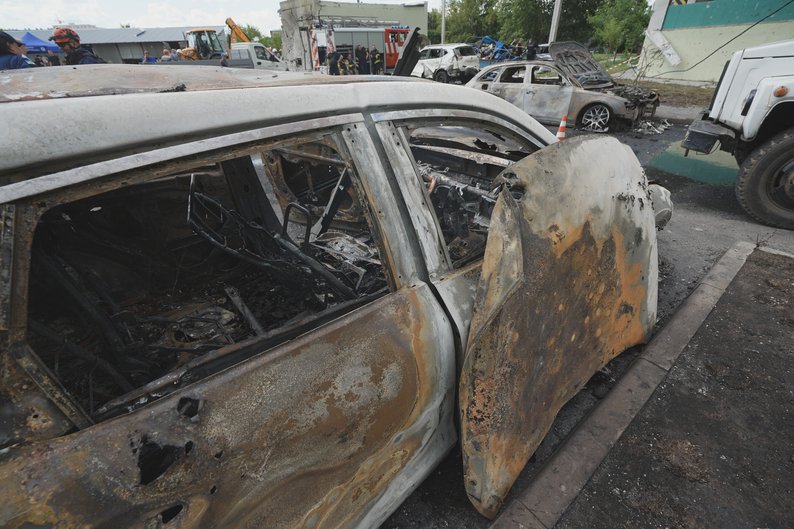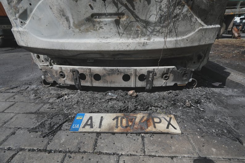 Номер від згорілої машини Максима Новака після авіаудару РФ 24 липня 2025 року. Суспільне Харків/Вікторія Якименко