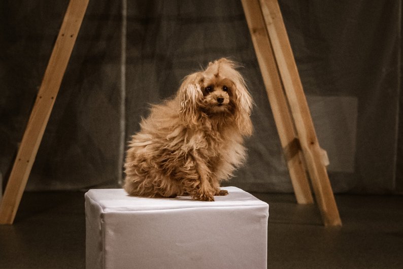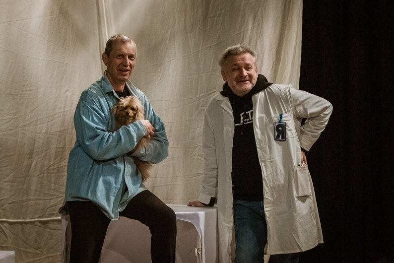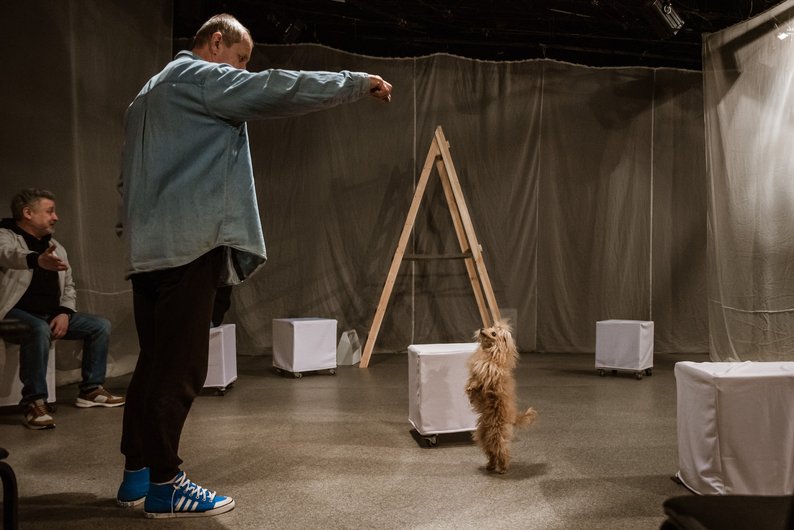 Собачка на репетиції вистави “Психи” в Харкові, травень 2025 року. Театр імені Шевченка “Березіль”