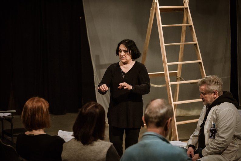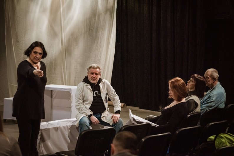 Актори і режисерка Оксана Стеценко на репетиції вистави “Психи” в Харкові, травень 2025 року. Театр імені Шевченка “Березіль”